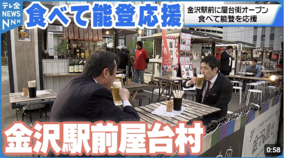 ネオ屋台ストリート ⾦沢の屋台として店舗運営 能登屋台村出張所として、2024年4⽉から11⽉まで店舗運営を⾏う。 (⽊・⾦・⼟曜⽇) 金沢大学生と連携し、能登の商品の応援を兼ねて営業を実施。5000人程度の集客を達成。